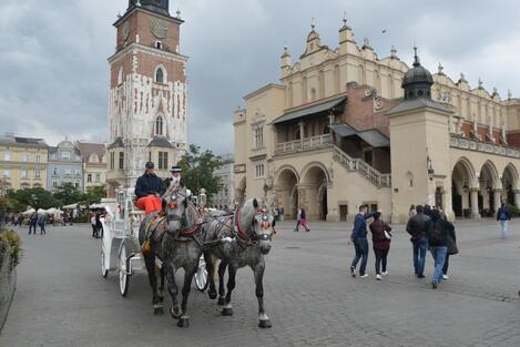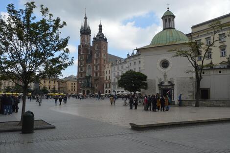 Am Morgen Fahrt per Bahn nach Tschenstochau. Hier befindet sich das wichtigste Pilgerziel Polens, die Ikone der "Schwarzen Madonna". Die Wallfahrtskirche auf dem "Jasna Góra", dem hellen Hügel, gleicht einer Festung und ist das polnische Nationalheiligtum. Viel haben wir schon gehört, vom polnischen Katholizismus, hier können wir ihn erleben. In einer kleinen Kapelle, im ältesten Teil der Anlage, knien die Gläubigen, tief im Gebet versunken. Weihgaben schmücken die Wände und unter Fanfarenklang hebt sich der silberne Vorhang und gibt den Blick frei, auf die Madonna. Ein bewegender Moment, dessen Spiritualität man sich nicht entziehen kann. Am Nachmittag Weiterfahrt per Bahn nach Krakau. Übernachtung in Krakau.