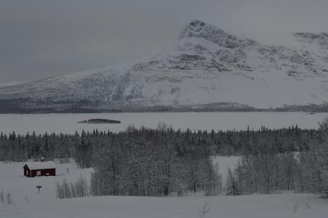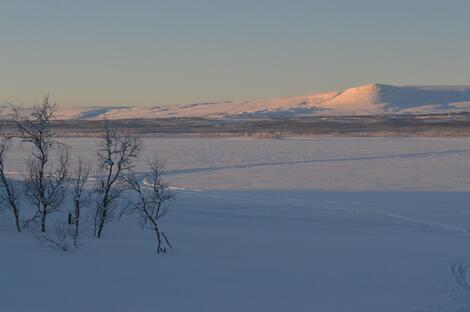 Aufstieg ins Gebirge. Ein Besuch auf der Hochebene des Pårtemassivs ist ein erstes Highlight der Tour. Wir folgen der Markierung des "Kungsleden" und tauchen ein in die winterliche Wildnis Lapplands. Die Pårtehütte selbst, liegt auf einer kleinen Halbinsel am nördlichen Ufer eines See?s.